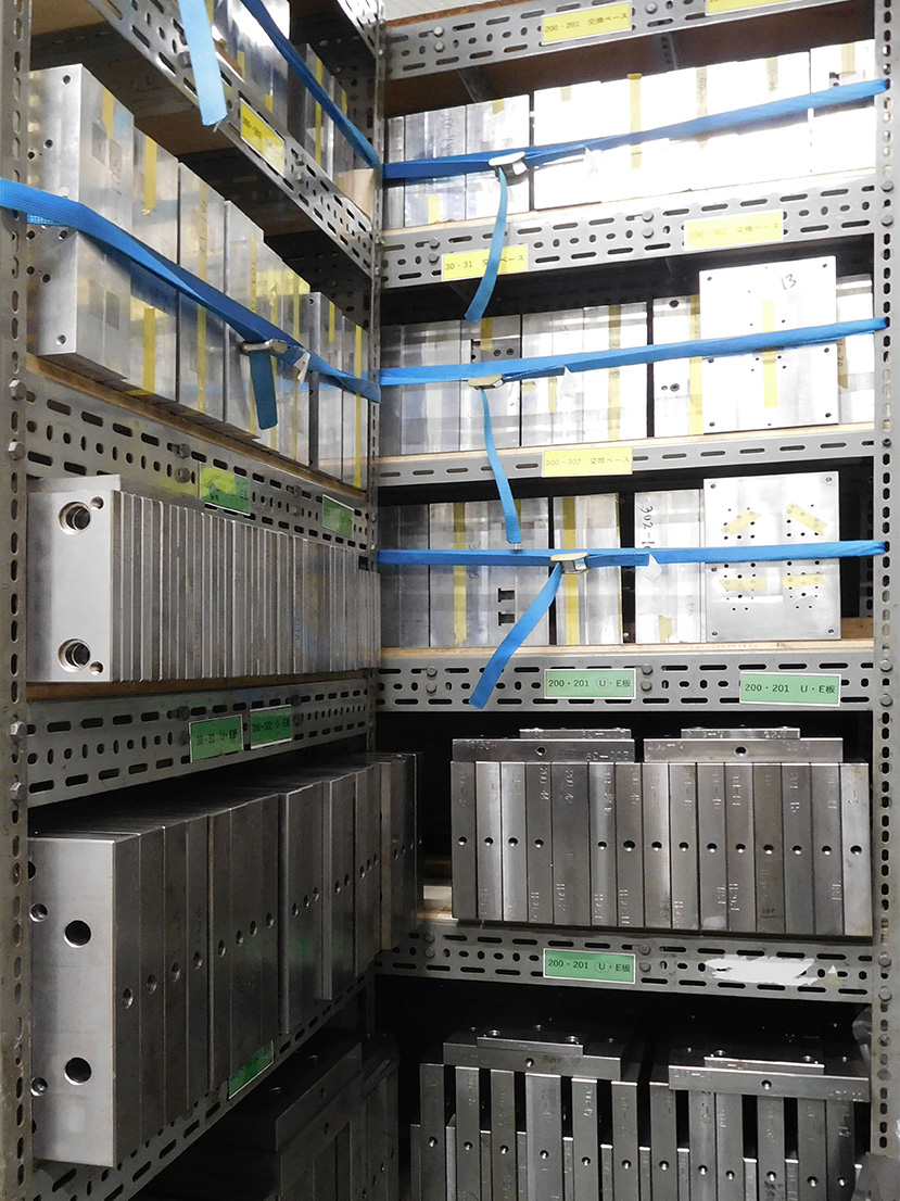 交換ダイセットで製作された、金型の保管は専用棚で行っています。