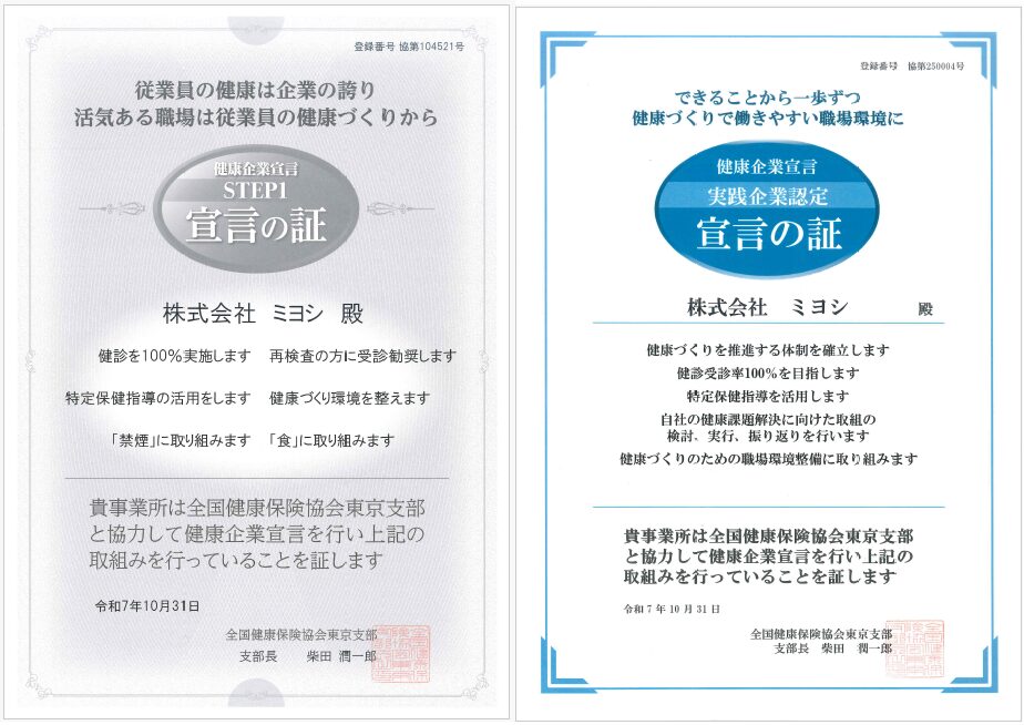 宣言にある重点項目を中心に、会社全体で健康経営・健康づくりに積極的に取り組み、従業員の健康増進と健康経営に努めてまいります。