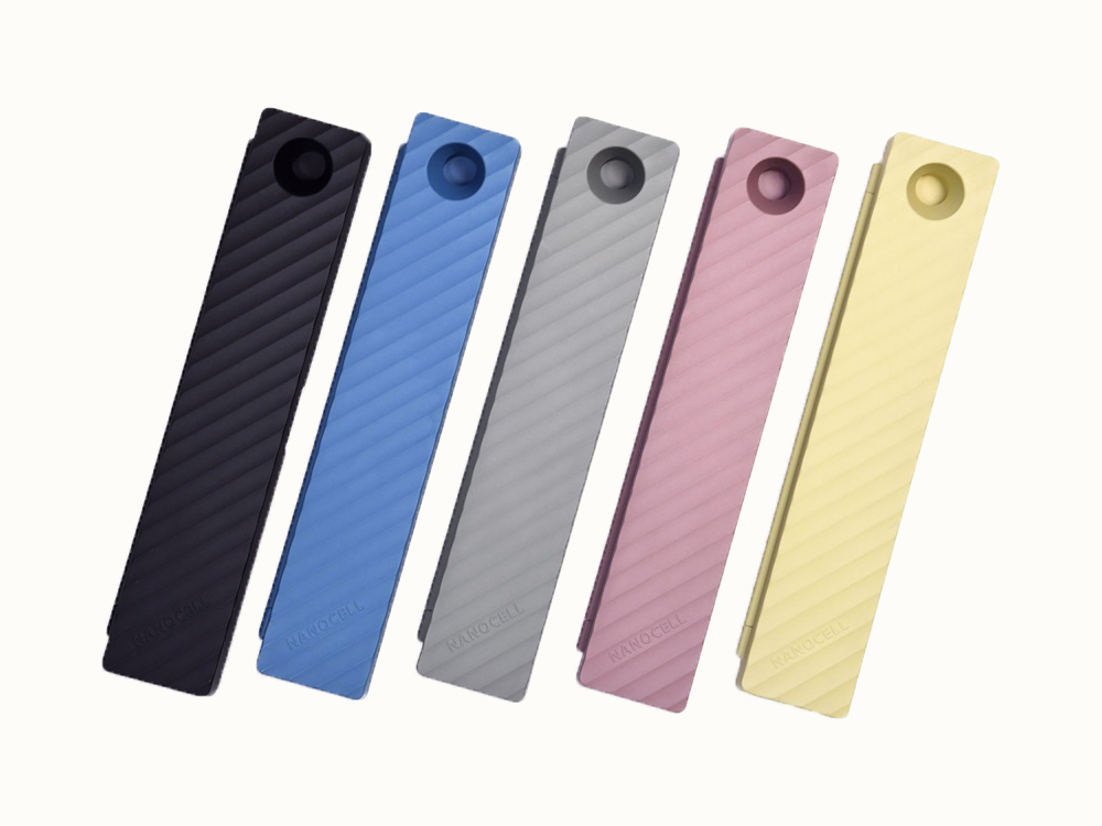 製作のきっかけは、Suicaなどの磁気カードで金属だとエラーが出てしまうので樹脂で作ってほしいという要望から。 外側の筐体はPOM+CNF10%で内側の色付きのプレートはPA6+CNF10%で製作しています。